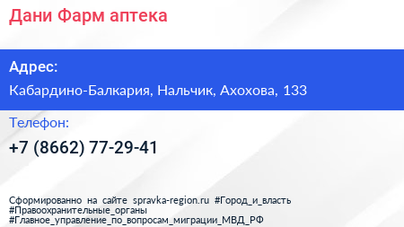 Дани Фарм, аптека по адресу Кабардино-Балкария, Нальчик, Ахохова, 133 в дальнейшем Организация, размещена в следующих категориях: