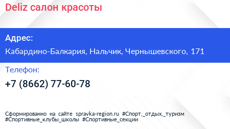 Deliz, салон красоты по адресу Кабардино-Балкария, Нальчик, Чернышевского, 171 в дальнейшем Организация, размещена в следующих категориях: