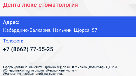Дента-люкс, стоматология по адресу Кабардино-Балкария, Нальчик, Щорса, 57 в дальнейшем Организация, размещена в следующих категориях: