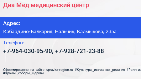 Диа-Мед, медицинский центр по адресу Кабардино-Балкария, Нальчик, Калмыкова, 235а в дальнейшем Организация, размещена в следующих категориях: