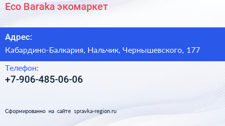 Eco Baraka, экомаркет по адресу Кабардино-Балкария, Нальчик, Чернышевского, 177 в дальнейшем Организация, размещена в следующих категориях: