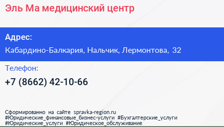 Эль-Ма, медицинский центр по адресу Кабардино-Балкария, Нальчик, Лермонтова, 32 в дальнейшем Организация, размещена в следующих категориях:
