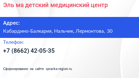Эль-ма, детский медицинский центр по адресу Кабардино-Балкария, Нальчик, Лермонтова, 30 в дальнейшем Организация, размещена в следующих категориях: