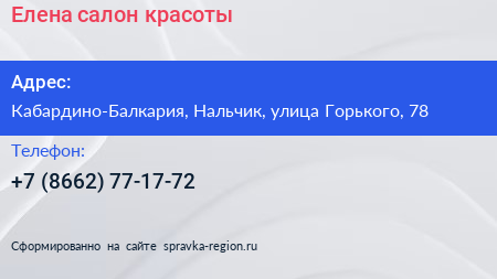 Елена, салон красоты по адресу Кабардино-Балкария, Нальчик, улица Горького, 78 в дальнейшем Организация, размещена в следующих категориях: