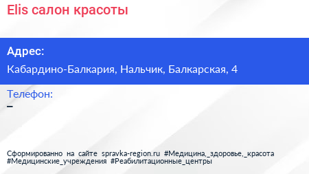 Elis, салон красоты по адресу Кабардино-Балкария, Нальчик, Балкарская, 4 в дальнейшем Организация, размещена в следующих категориях: