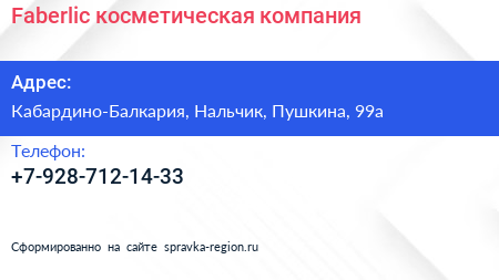 Faberlic, косметическая компания по адресу Кабардино-Балкария, Нальчик, Пушкина, 99а в дальнейшем Организация, размещена в следующих категориях:
