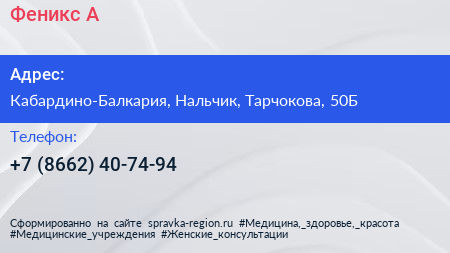 Феникс А по адресу Кабардино-Балкария, Нальчик, Тарчокова, 50Б в дальнейшем Организация, размещена в следующих категориях:
