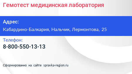 Гемотест, медицинская лаборатория по адресу Кабардино-Балкария, Нальчик, Лермонтова, 25 в дальнейшем Организация, размещена в следующих категориях: