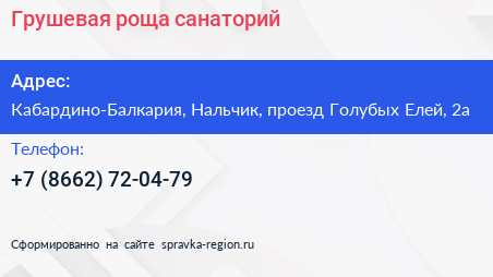 Грушевая роща, санаторий по адресу Кабардино-Балкария, Нальчик, проезд Голубых Елей, 2а в дальнейшем Организация, размещена в следующих категориях: