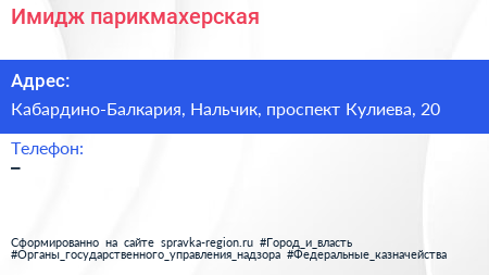 Имидж, парикмахерская по адресу Кабардино-Балкария, Нальчик, проспект Кулиева, 20 в дальнейшем Организация, размещена в следующих категориях: