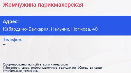 Жемчужина, парикмахерская по адресу Кабардино-Балкария, Нальчик, Ногмова, 40 в дальнейшем Организация, размещена в следующих категориях: