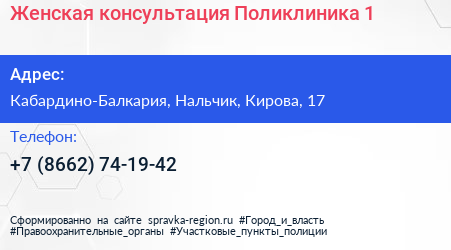 Женская консультация, Поликлиника №1 по адресу Кабардино-Балкария, Нальчик, Кирова, 17 в дальнейшем Организация, размещена в следующих категориях: