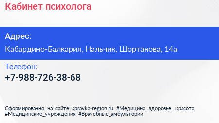 Кабинет психолога по адресу Кабардино-Балкария, Нальчик, Шортанова, 14а в дальнейшем Организация, размещена в следующих категориях:
