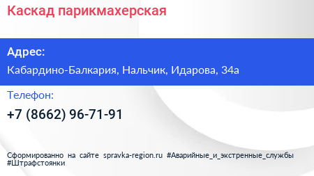 Каскад, парикмахерская по адресу Кабардино-Балкария, Нальчик, Идарова, 34а в дальнейшем Организация, размещена в следующих категориях: