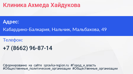 Клиника Ахмеда Хайдукова по адресу Кабардино-Балкария, Нальчик, Мальбахова, 49 в дальнейшем Организация, размещена в следующих категориях:
