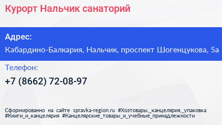Курорт Нальчик, санаторий по адресу Кабардино-Балкария, Нальчик, проспект Шогенцукова, 5а в дальнейшем Организация, размещена в следующих категориях: