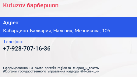 Kutuzov, барбершоп по адресу Кабардино-Балкария, Нальчик, Мечникова, 105 в дальнейшем Организация, размещена в следующих категориях: