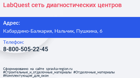 LabQuest, сеть диагностических центров по адресу Кабардино-Балкария, Нальчик, Пушкина, 6 в дальнейшем Организация, размещена в следующих категориях: