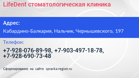 LifeDent, стоматологическая клиника по адресу Кабардино-Балкария, Нальчик, Чернышевского, 197 в дальнейшем Организация, размещена в следующих категориях: