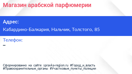 Магазин арабской парфюмерии по адресу Кабардино-Балкария, Нальчик, Толстого, 85 в дальнейшем Организация, размещена в следующих категориях:
