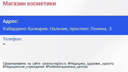 Магазин косметики по адресу Кабардино-Балкария, Нальчик, проспект Ленина, 3 в дальнейшем Организация, размещена в следующих категориях: