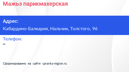 Мажьэ, парикмахерская по адресу Кабардино-Балкария, Нальчик, Толстого, 96 в дальнейшем Организация, размещена в следующих категориях: