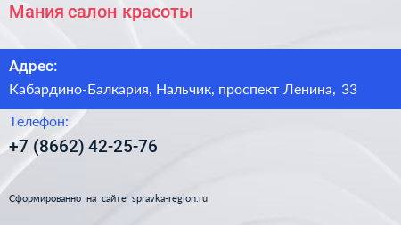 Мания, салон красоты по адресу Кабардино-Балкария, Нальчик, проспект Ленина, 33 в дальнейшем Организация, размещена в следующих категориях: