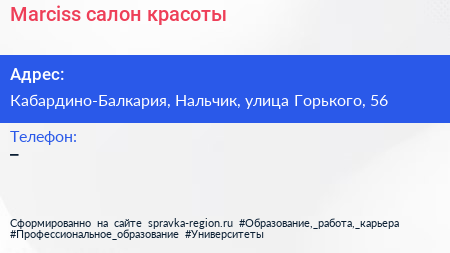 Marciss, салон красоты по адресу Кабардино-Балкария, Нальчик, улица Горького, 56 в дальнейшем Организация, размещена в следующих категориях: