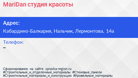 MariDan, студия красоты по адресу Кабардино-Балкария, Нальчик, Лермонтова, 14а в дальнейшем Организация, размещена в следующих категориях: