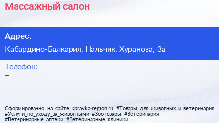 Массажный салон по адресу Кабардино-Балкария, Нальчик, Хуранова, 3а в дальнейшем Организация, размещена в следующих категориях: