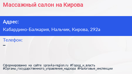 Массажный салон на Кирова по адресу Кабардино-Балкария, Нальчик, Кирова, 292а в дальнейшем Организация, размещена в следующих категориях: