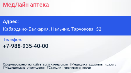 МедЛайн, аптека по адресу Кабардино-Балкария, Нальчик, Тарчокова, 52 в дальнейшем Организация, размещена в следующих категориях: