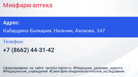 Миафарм, аптека по адресу Кабардино-Балкария, Нальчик, Ахохова, 147 в дальнейшем Организация, размещена в следующих категориях: