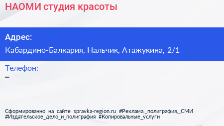 НАОМИ, студия красоты по адресу Кабардино-Балкария, Нальчик, Атажукина, 2/1 в дальнейшем Организация, размещена в следующих категориях: