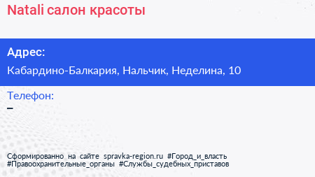 Natali, салон красоты по адресу Кабардино-Балкария, Нальчик, Неделина, 10 в дальнейшем Организация, размещена в следующих категориях: