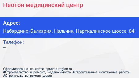 Неотон, медицинский центр по адресу Кабардино-Балкария, Нальчик, Нарткалинское шоссе, 84 в дальнейшем Организация, размещена в следующих категориях: