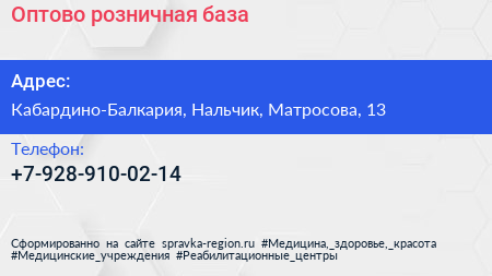 Оптово-розничная база по адресу Кабардино-Балкария, Нальчик, Матросова, 13 в дальнейшем Организация, размещена в следующих категориях: