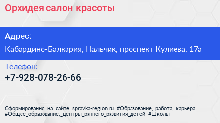 Орхидея, салон красоты по адресу Кабардино-Балкария, Нальчик, проспект Кулиева, 17а в дальнейшем Организация, размещена в следующих категориях: