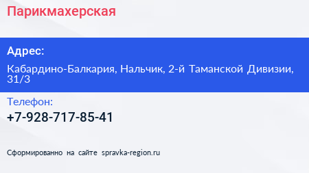 Парикмахерская по адресу Кабардино-Балкария, Нальчик, 2-й Таманской Дивизии, 31/3 в дальнейшем Организация, размещена в следующих категориях: