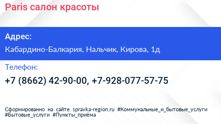 Paris, салон красоты по адресу Кабардино-Балкария, Нальчик, Кирова, 1д в дальнейшем Организация, размещена в следующих категориях: