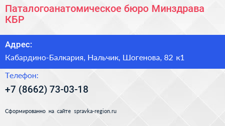 Паталогоанатомическое бюро Минздрава КБР по адресу Кабардино-Балкария, Нальчик, Шогенова, 82 к1 в дальнейшем Организация, размещена в следующих категориях: