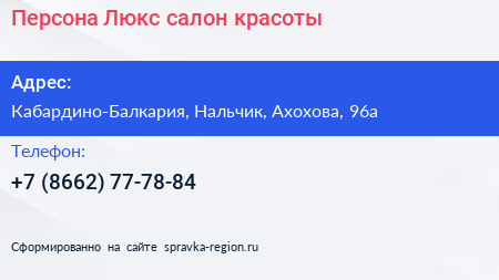 Персона Люкс, салон красоты по адресу Кабардино-Балкария, Нальчик, Ахохова, 96а в дальнейшем Организация, размещена в следующих категориях: