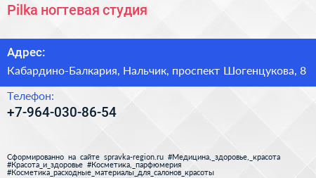 Pilka, ногтевая студия по адресу Кабардино-Балкария, Нальчик, проспект Шогенцукова, 8 в дальнейшем Организация, размещена в следующих категориях: