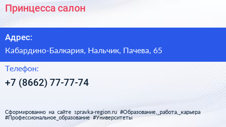 Принцесса, салон по адресу Кабардино-Балкария, Нальчик, Пачева, 65 в дальнейшем Организация, размещена в следующих категориях: