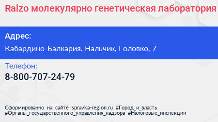 Ralzo, молекулярно-генетическая лаборатория по адресу Кабардино-Балкария, Нальчик, Головко, 7 в дальнейшем Организация, размещена в следующих категориях: