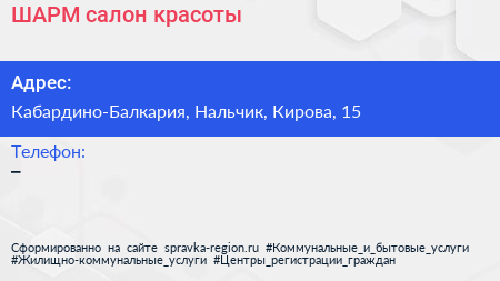 ШАРМ, салон красоты по адресу Кабардино-Балкария, Нальчик, Кирова, 15 в дальнейшем Организация, размещена в следующих категориях: