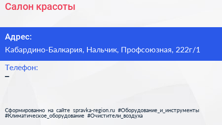 Салон красоты по адресу Кабардино-Балкария, Нальчик, Профсоюзная, 222г/1 в дальнейшем Организация, размещена в следующих категориях: