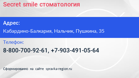 Secret & smile, стоматология по адресу Кабардино-Балкария, Нальчик, Пушкина, 35 в дальнейшем Организация, размещена в следующих категориях: