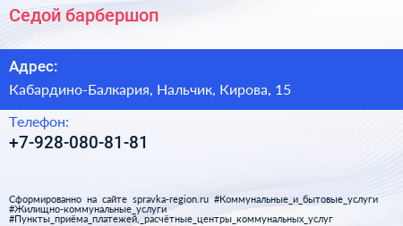 Седой, барбершоп по адресу Кабардино-Балкария, Нальчик, Кирова, 15 в дальнейшем Организация, размещена в следующих категориях: