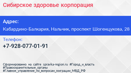 Сибирское здоровье, корпорация по адресу Кабардино-Балкария, Нальчик, проспект Шогенцукова, 28 в дальнейшем Организация, размещена в следующих категориях: